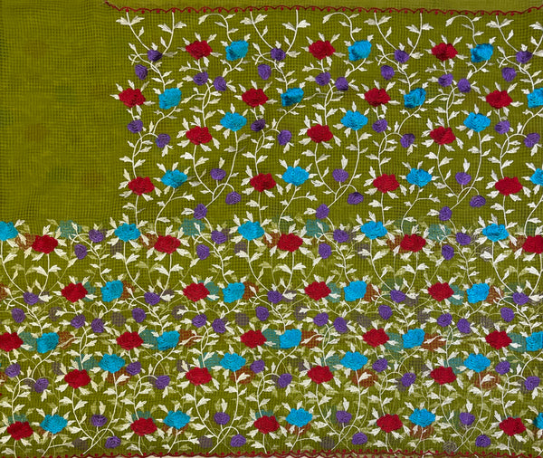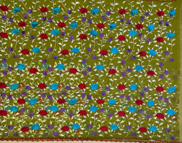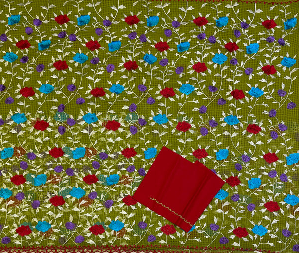 Basil green kota scalloped saree with parsi gara embroidery all over the saree in contrast colours. Comes with a contrast red blouse with green embroidery for sleeves.