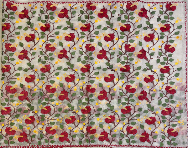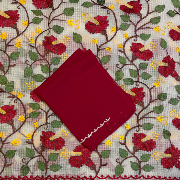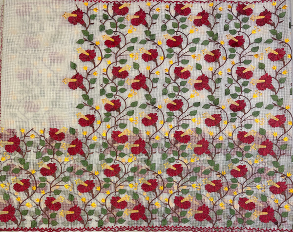 White kota scalloped saree with hibiscus embroidery all over the saree. Comes with a plain red blouse with green embroidery for sleeves.