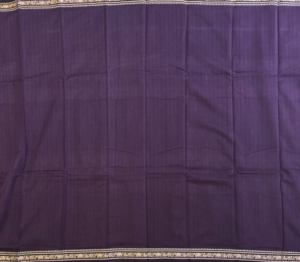 Experience the comfort and ease of this Narayanpet cotton saree, featuring a soft and unstarched fabric that is effortless to maintain and pleat. The deep purple body is accented with a self border and detailed with thread peacock and elephant motifs in the 1" border. The simple pallu is beautifully contrasted with blocks of color. Please note that this saree does not include a blouse.