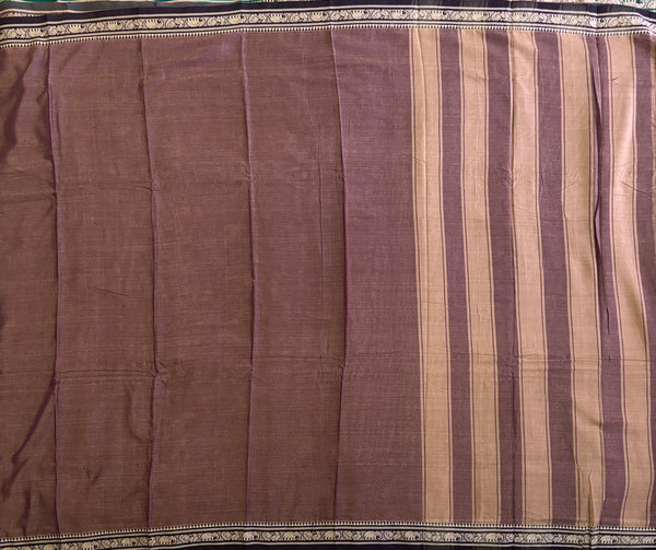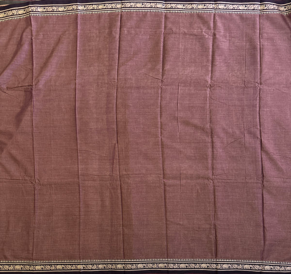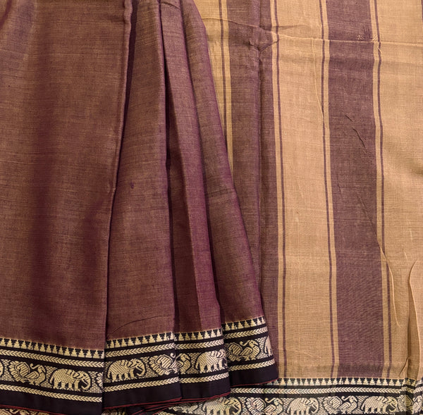 Experience the comfort and ease of this Narayanpet cotton saree, featuring a soft and unstarched fabric that is effortless to maintain and pleat. The brown body is accented with a self border and detailed with thread peacock and elephant motifs in the 1" border. The simple pallu is beautifully contrasted with blocks of color. Please note that this saree does not include a blouse.