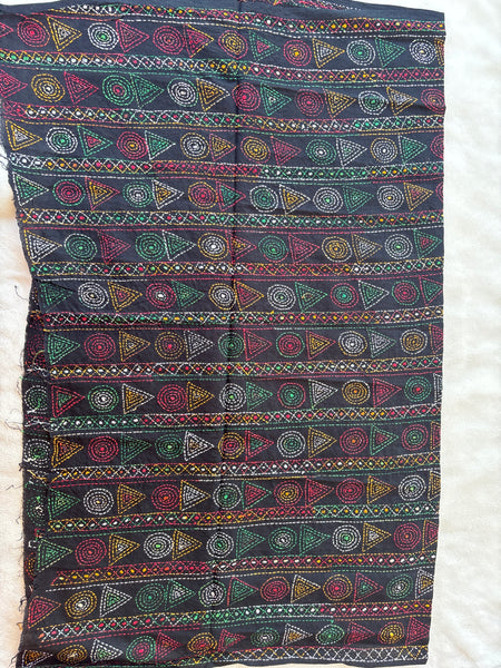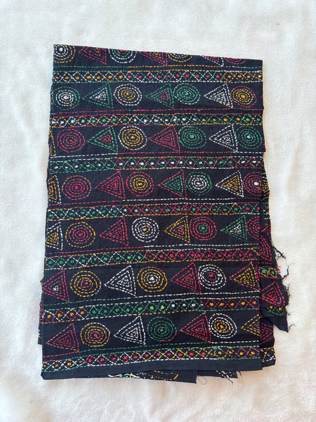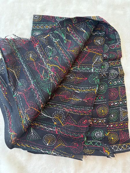 Intricate embroidery in multicolours  on black pure cotton cloth of 1 metre. The embroidery is all over, done in kantha style of Bengal. Vintage style, perfect for festive occasions and daily wear too.