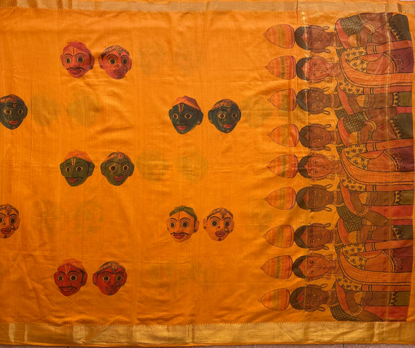 Handwoven Mangalgiri cotton features a marigold design with missing checks, remains unstarched, and showcases Cheriyal faces printed throughout, complemented by a renowned Telangana artist's painting on the pallu. This piece is essential for enthusiasts of Telugu art.
