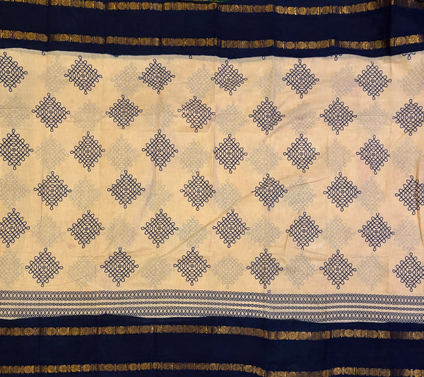 This Sungudi cotton saree features a graceful light beige and black color combination, adorned with our unique signature kolam design throughout. Please note that a blouse is not included.
