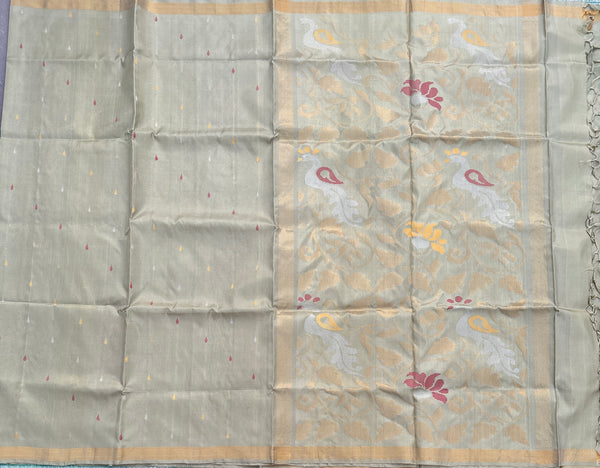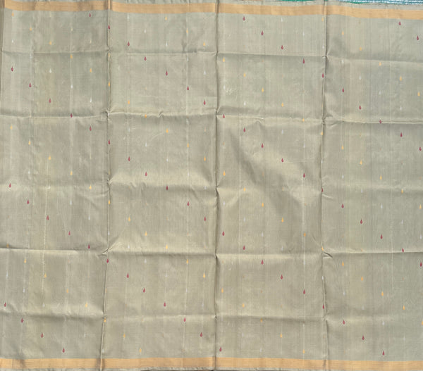 Pleasant and festive cardamom green Uppada-Jamdani silk with silver and gold thilakam motifs inlaid in Jamdani style.