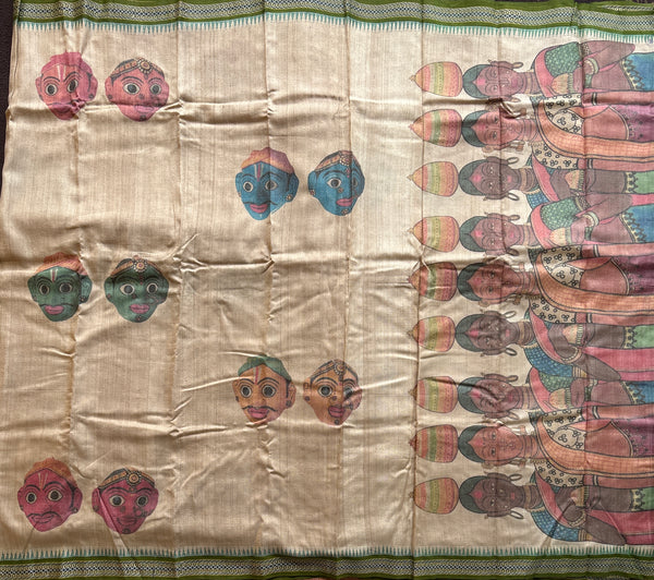 Cheriyal dolls of Telangana digitally printed on natural Vidarbha Tussar with a light green border.