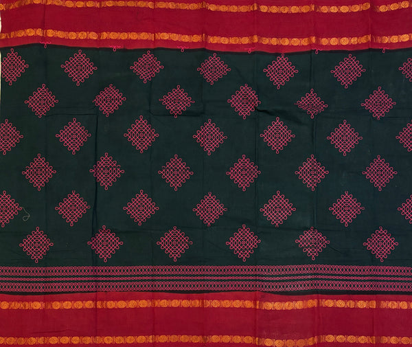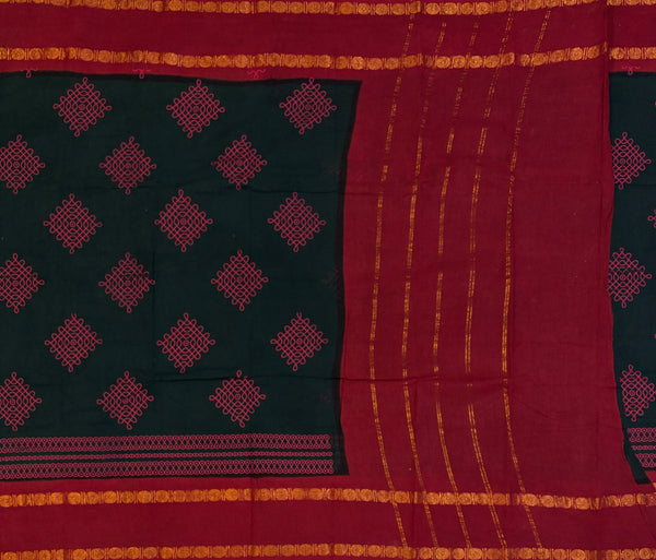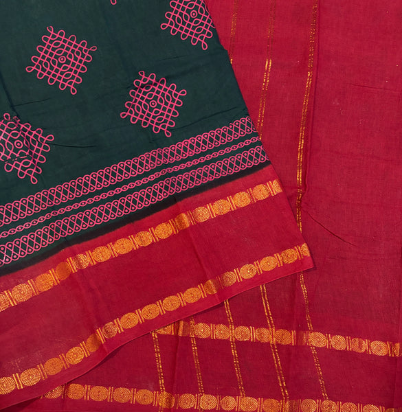 This Sungudi cotton saree features a bold bottle green and red color combination, adorned with our unique signature kolam design throughout. Please note that a blouse is not included.