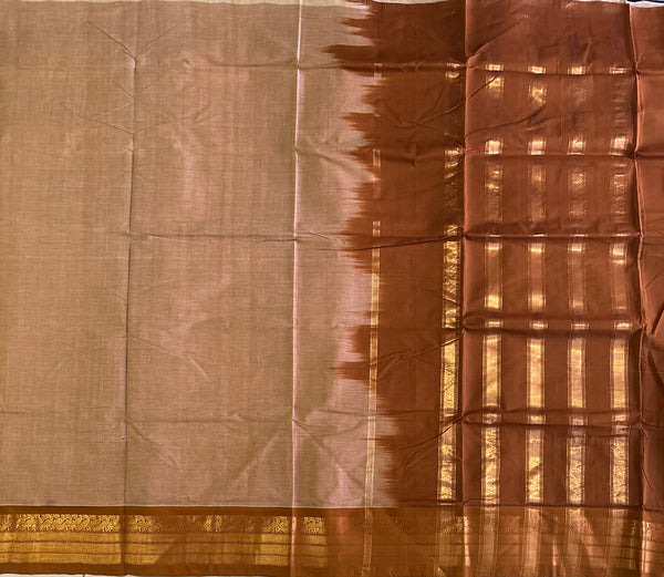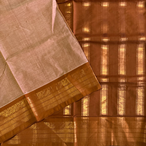Cantaloupe orange body 120 count handwoven cotton Guntur saree. The border and pallu are a squash orange. 4 Inch single side border with traditional peacock motifs.
