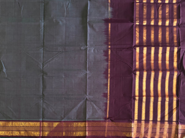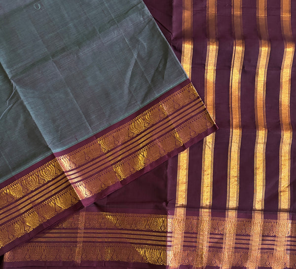 Two tone robin blue and merlot maroon body 120 count handwoven cotton Guntur saree. The border and pallu are a merlot maroon. 4 Inch single side border with traditional line and lotus motifs.