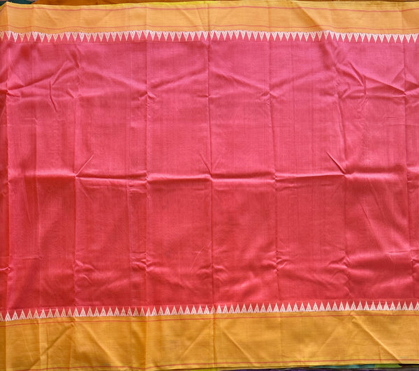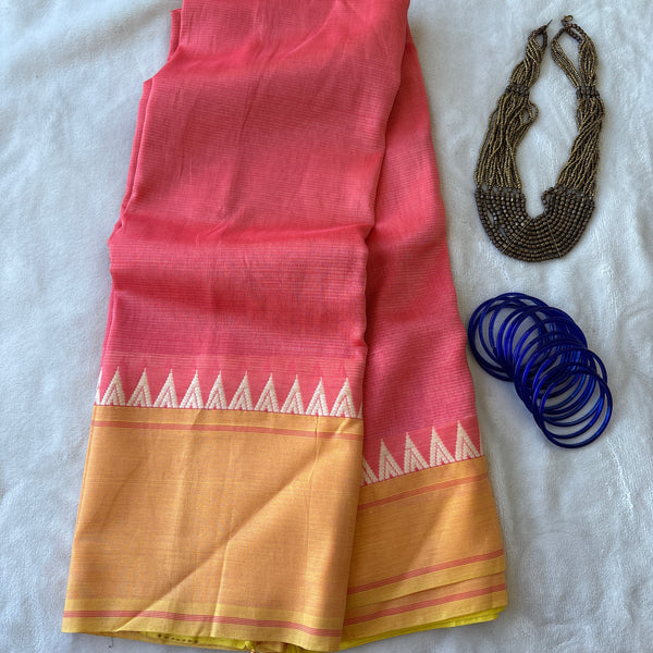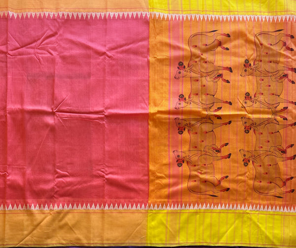 Crafted from exquisite flamingo pink and yellow silk cotton and meticulously handwoven on a traditional pit loom, this saree features a Pichwai painting print on the pallu. Complete with a contrast yellow running blouse. This saree is perfect for those who appreciate the beauty of traditional handcrafted art.