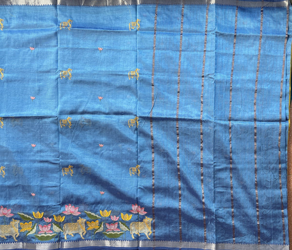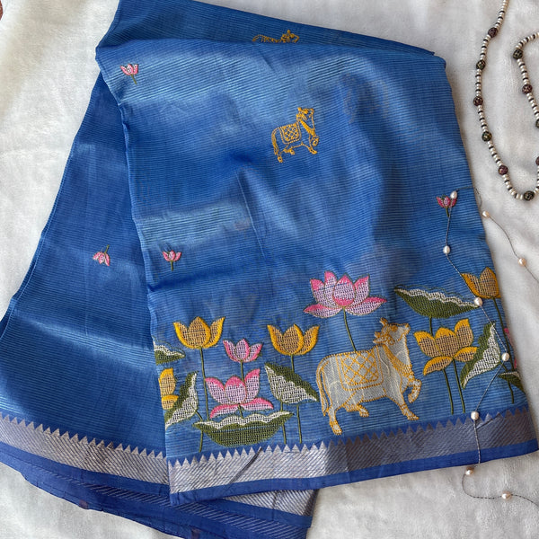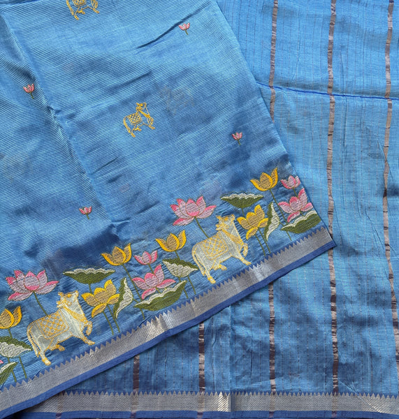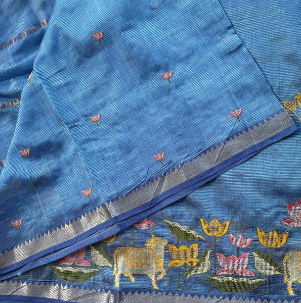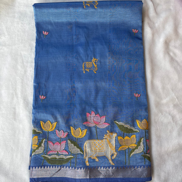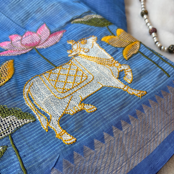 Periwinkle blue handwoven silk cotton MangalGiri with cross stitch and filling stitch embroidery Pichwai and lotuses all over. Border on either side is silver.