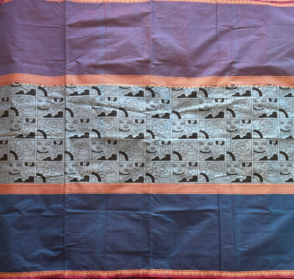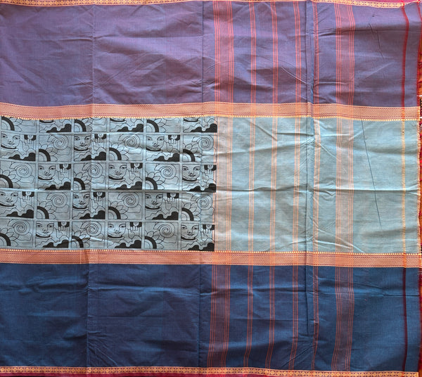 This hand-woven Kanchi cotton saree has a Muppangu or three-part design and is presented in a ttwo tone red & blie, sky blue, and robin blue color scheme. The top and bottom portions are plain, while the centre marigold portion has a hand-print of the Buddha.