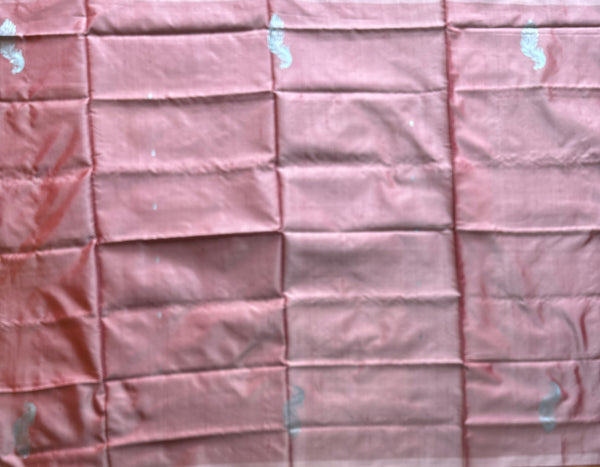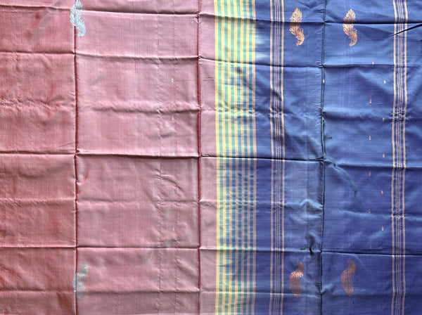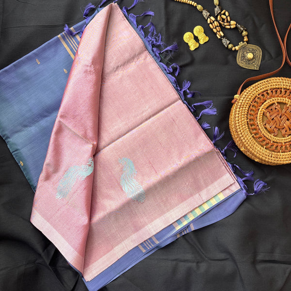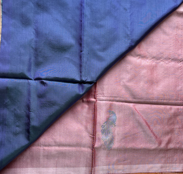 DUsty rose Chinnalampattu in a pearly shade with peacock motifs and contrast dual tone blue tasseled pallu and blouse