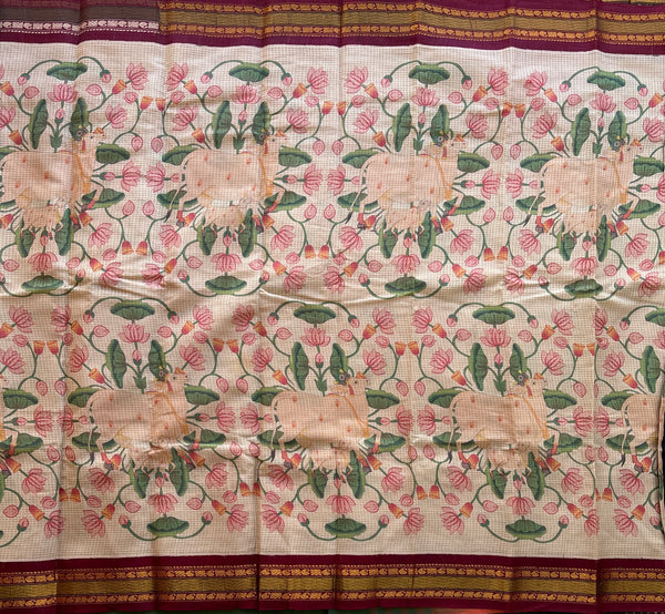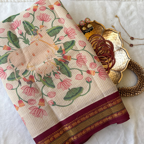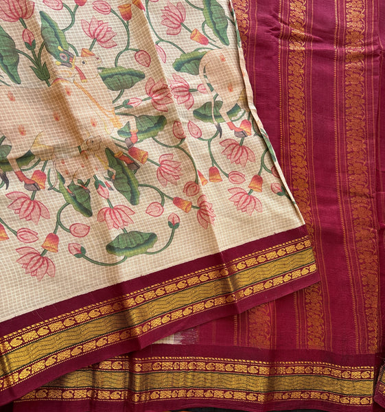 Traditional Gadwal cotton in off white with silk borders in mAroon and silk palla in maroon.