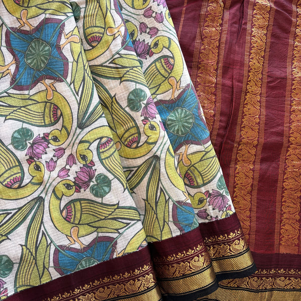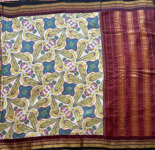 Traditional Gadwal cotton in off white with split silk borders in black and maroon and silk palla in mAroon.
