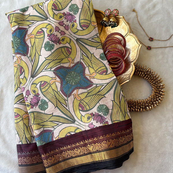 This saree has been digitally printed with beautifully laid parrots and does not come with a blouse.