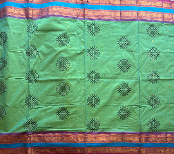 Chettinad cotton saree in sea green with Annapakshi & Rudraksha border in pink and cyan blue and Kolam block prints.