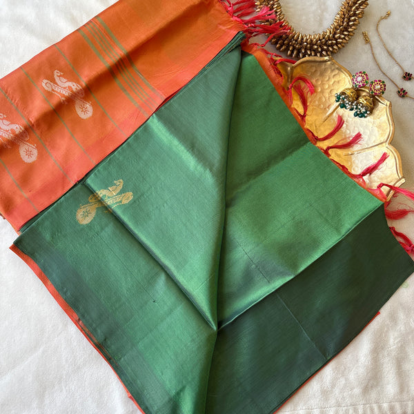 Two tone green and burnt orange Chinnalampattu with thread motifs and contrast orange coloured tasseled pallu and blouse