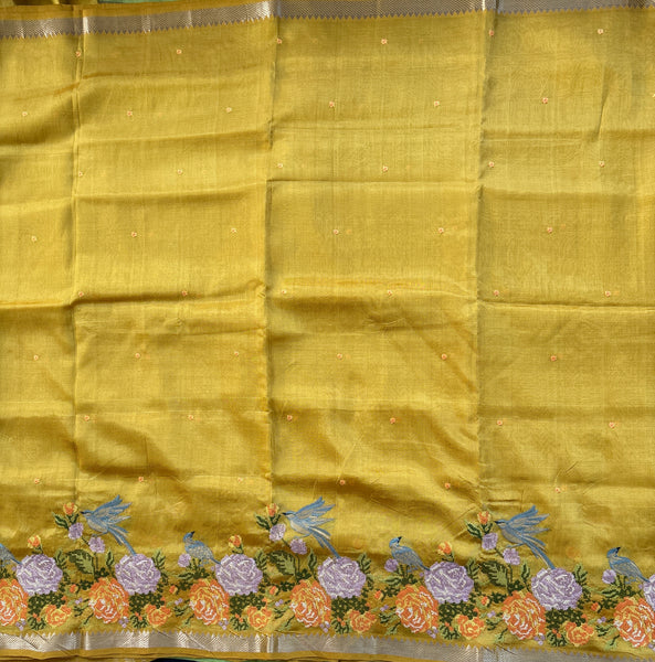 Golden handwoven silk cotton MangalGiri with cross stitch embroidered roses all over. Border on either side is silver.