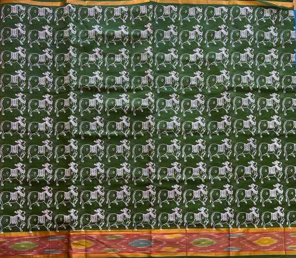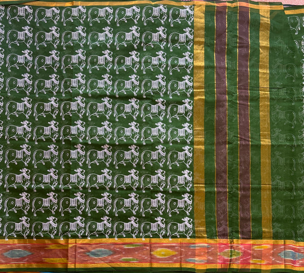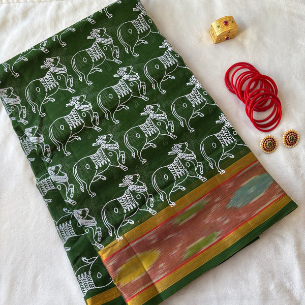 This Venkatgiri saree in emerald green is handwoven from cotton. The elegant design is accentuated by a golden Kadhi border on either side of a multi colour Ikat border adding a touch of light and effortless drapability. It has been handprinted all over with the our signature cow print in white. Please note that a blouse is not included with this product.