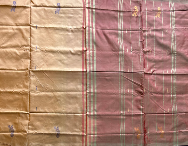 Light beige Chinnalampattu with Veena motifs and contrast dual tone rEd and mint coloured tasseled pallu and blouse