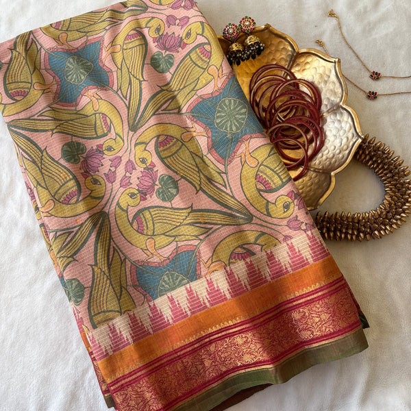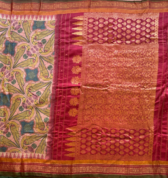 Traditional Gadwal cotton in dusty rose with split silk temple borders in yellow & green and a grand silk palla in maroon.