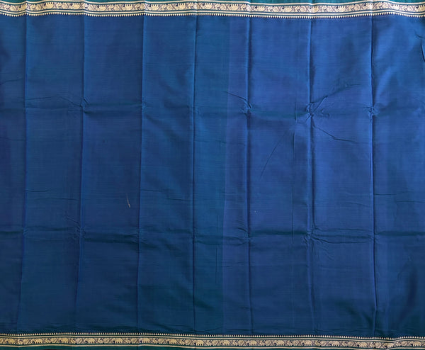 Experience the comfort and ease of this Narayanpet cotton saree, featuring a soft and unstarched fabric that is effortless to maintain and pleat. The two tone green and blue (teal) body is accented with a self border and detailed with thread peacock and elephant motifs in the 1" border. The simple pallu is beautifully contrasted with blocks of color. Please note that this saree does not include a blouse.