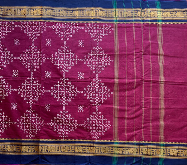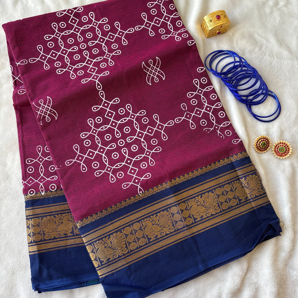 Chettinad cotton saree in mAroon with annapakshi border in deep blue and Kolam block prints.