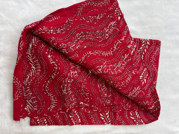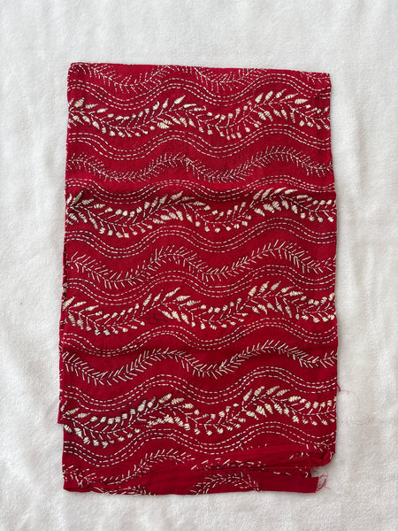 Intricate embroidery in beige on dark red pure cotton cloth of 1 metre. The embroidery is all over, done in kantha style of Bengal. Vintage style, perfect for festive occasions and daily wear too.