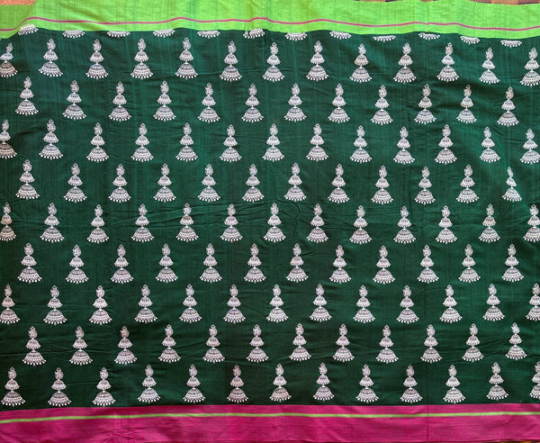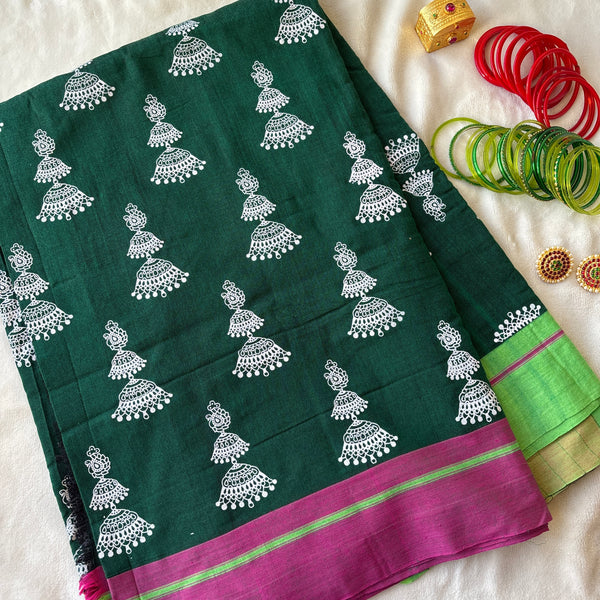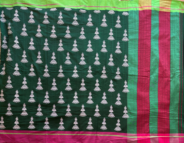 Handwoven Patteda anchu cotton saree in bottle green hand block printed with signature jhumki or jimikki design all over and a Ganga-Jamuna border of pink and green.