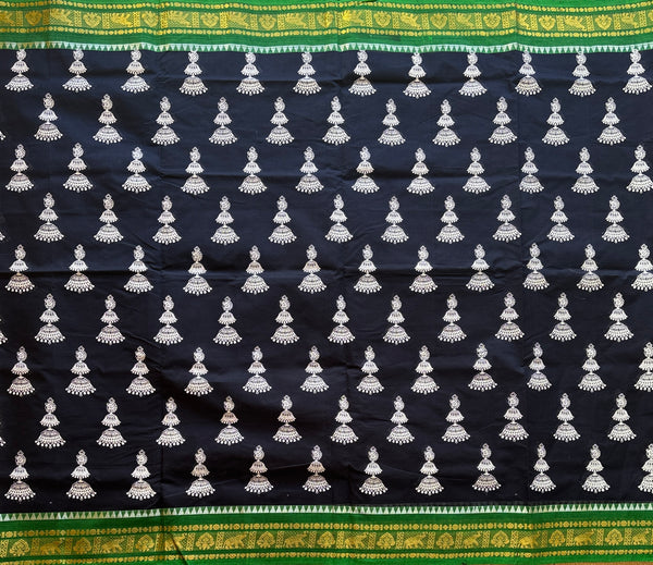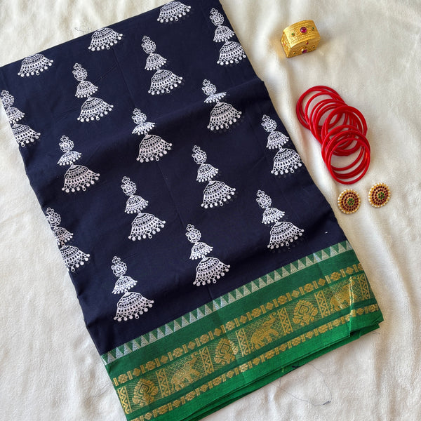 Navy blue with green annam thread border kora (coarse) cotton saree handwoven in Bandarulanka, Andhra Pradesh. Has a length of 5.25 metres and does not come with a blouse. The saree has our signature jhumka print all over it.