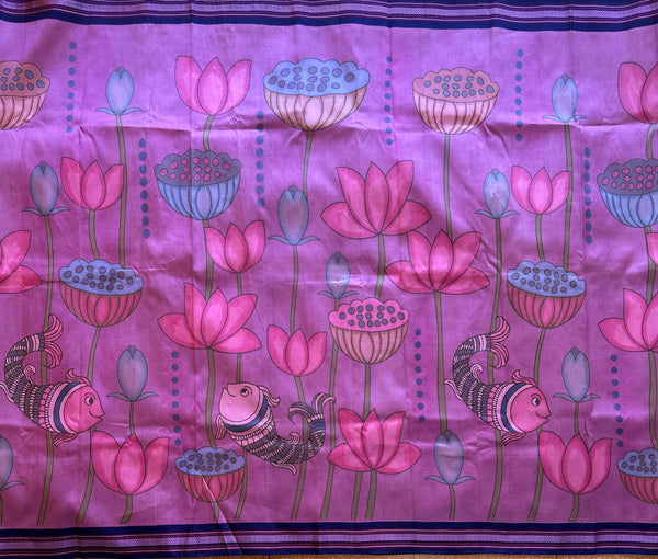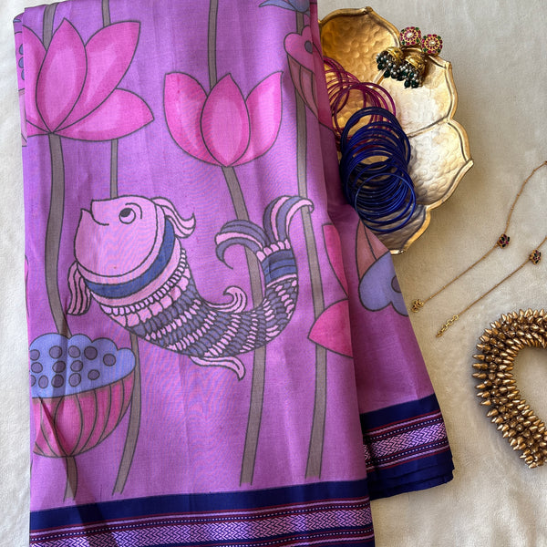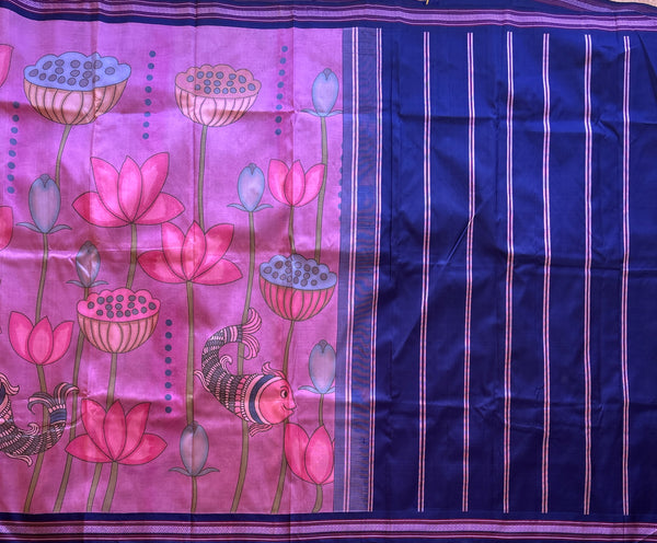 Wildflower pink pure silk handwoven saree features a navy blue border. Comes with Kalamkari print all over the saree