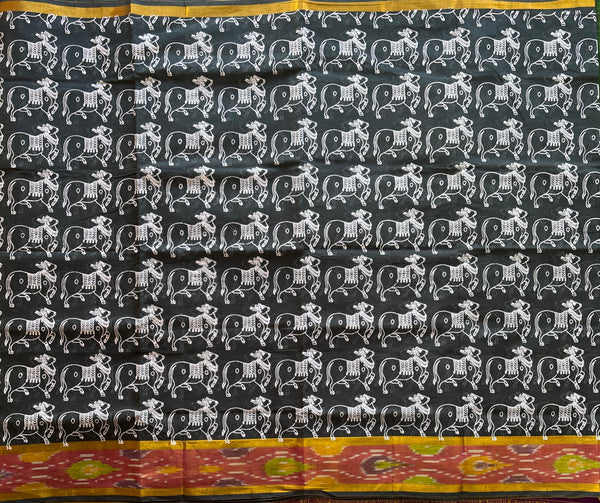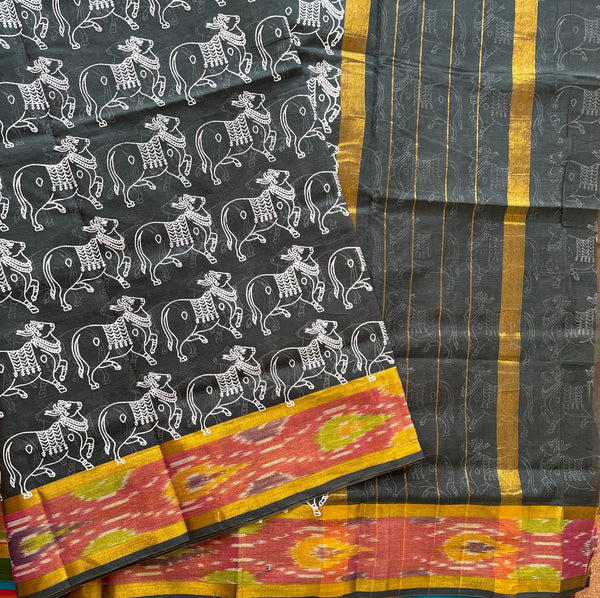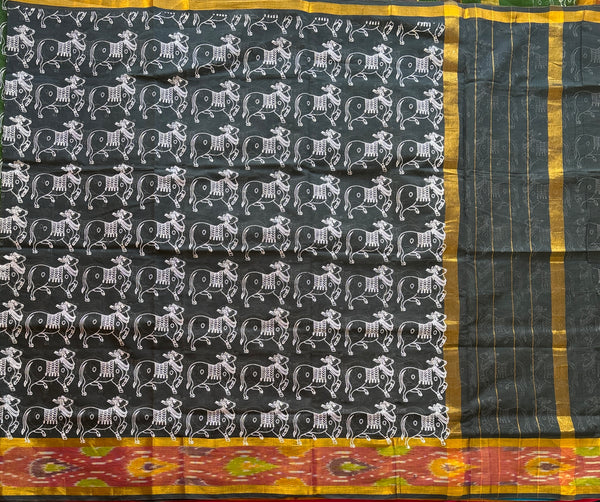 This Venkatgiri saree in slate grey is handwoven from cotton. The elegant design is accentuated by a golden Kadhi border on either side of a multi colour Ikat border adding a touch of light and effortless drapability. It has been handprinted all over with the our signature cow print in white. Please note that a blouse is not included with this product.